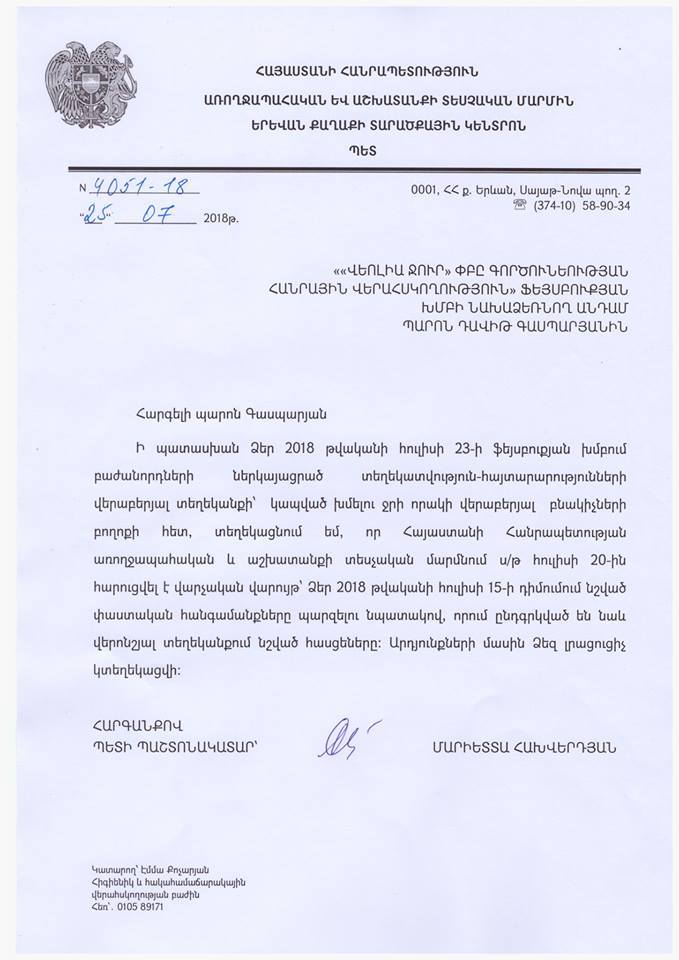 Բաժանորդների խմելու ջրի մատակարարման կամայական և կամ առանց ծանուցման ընդհատումների, բաժանորդին անտեսելու ու ըստ այդմ իր սպասարկման որակի ցուցանիշները լավ լույսի ներքո ներկայացնելու մոլուցքով տարված «Վեոլիա ջուր» ՓԲԸ ղեկավարության կողմից հրամցվում է ոչ լիարժեք տեղեկատվություն»։