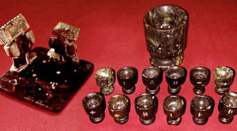 Նեֆրիտե այս սպասքը հայտնաբերել է Էլիաս Սոտոմայերի արշավախումբը։ Այն բաղկացած է 13 գավաթներից։ Դրանցից 12-ն իդեալական հավասար ծավալ ունեն, իսկ 13-րդը շատ ավելի մեծ է։ Եթե 12 փոքրիկ գավաթները լցվեն հեղուկով, իսկ հետո դատարկվեն մեծի մեջ, ապա այն կլցվի մինչև եզրը։ Բոլոր գավաթները պատրաստված են նեֆրիտից։ Քարն այնքան անթերի է մշակված, որ դա ստիպում է ենթադրել անցյալում քարի մշակման բարձր տեխնոլոգիայի առկայության մասին, որը նման է եղել ժամանակակից խառատահաստոցի օգտագործմանը։
