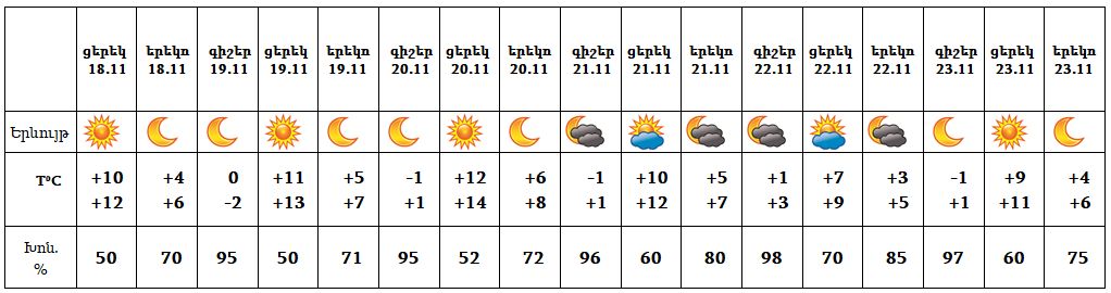 Հանրապետության տարածքում նոյեմբերի 18-ի ցերեկը, 19-20-ը, 23-ին սպասվում է առանց տեղումների եղանակ: Այս մասին տեղեկացրել է ԱԻՆ լրատվական ծառայությունը։
