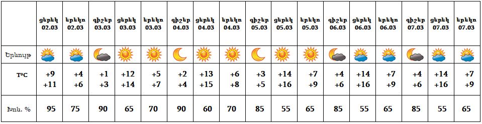 Երևան քաղաքում՝ մարտի 2-ի ցերեկը սպասվում է թույլ անձրև, մարտի 3-7-ը սպասվում է առանց տեղումների եղանակ։