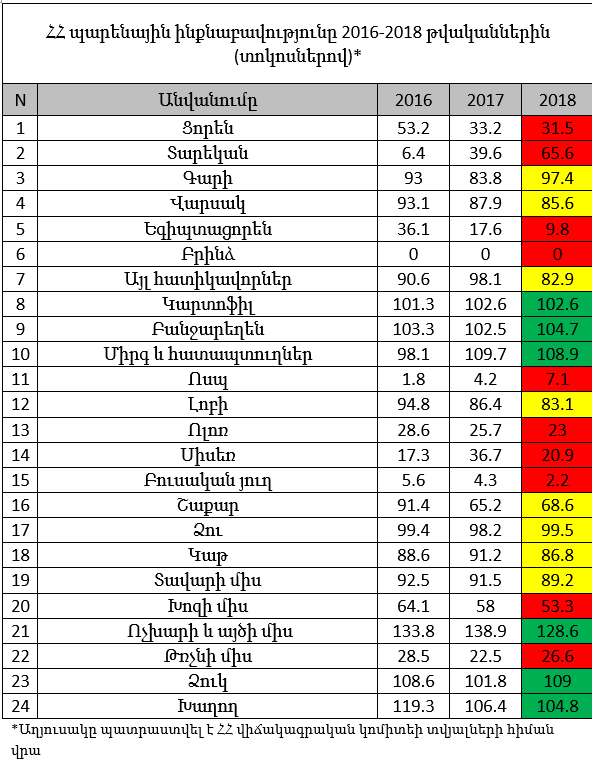 ՀՀ վիճակագրական կոմիտեի տվյալների համաձայն՝ Հայաստանը պարենային ինքնաբավության լուրջ խնդիր ունի հետևյալ ապրանքների մասով՝ ցորեն, տարեկան, եգիպտացորեն, բրինձ, ոսպ, բուսական յուղ, խոզի միս և թռչնի միս: ՀՀ կառավարությունը առաջնահերթ պետք է գնահատի այս ապրանքների առկա պաշարները և պետական-մասնավոր համագործակցությամբ ապահովի լրացուցիչ ներկրում: