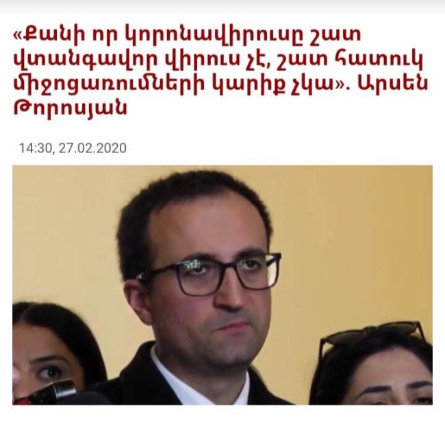 Ի դեպ, Փաշինյանի սիրելի ու հովանավորած կադրը` ՀՀ առողջապահության նախարարի պաշտոնը զբաղեցնող Արսեն Թորոսյանը, ՀՀ-ում նոր կորոնավիրուսով վարակվածության առաջին դեպքի հաստատումից 3 օր առաջ` փետրվարի 27-ին, հայտարարեց` «Քանի որ կորոնավիրուսը շատ վտանգավոր վիրուս չէ, շատ հատուկ միջոցառումների կարիք չկա»: Հայաստանում մարտի 16-ից հայտարարված արտակարգ դրությունը շատ հատուկ միջոցառում չէ՞, և եթե այդպիսին չէ, ապա ո՞րն է շատ հատուկ միջոցառումը…