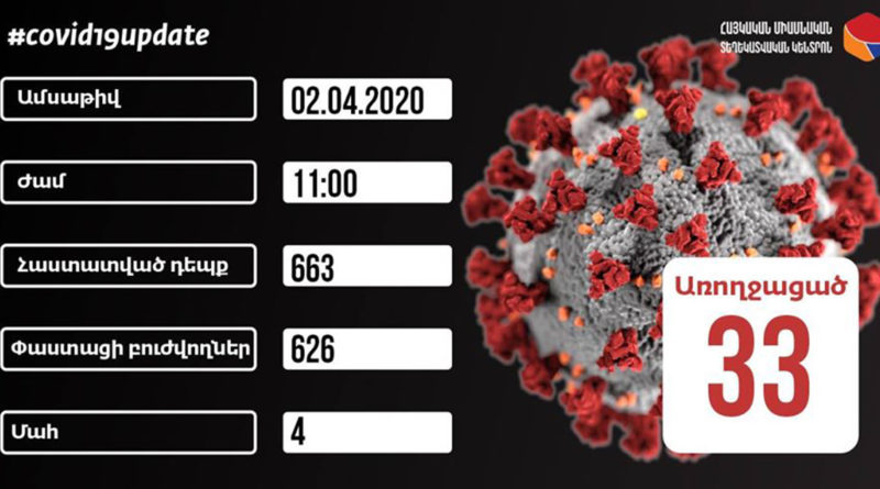 Ապրիլի 1-ի դրությամբ կորոնավիրուսից բուժվածների թիվը 33 է, փաստացի բուժվողներինը՝ 626, բացասական թեստերը՝ 2940, մահվան ելքերը՝ 4: