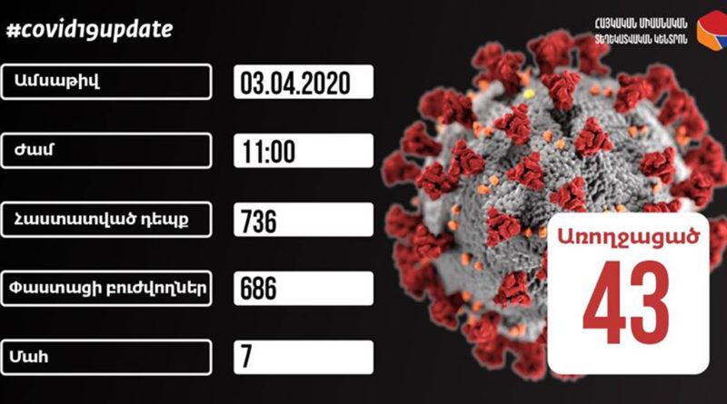 Ապրիլի 3-ի դրությամբ կորոնավիրուսից բուժվածների թիվը 43 է, փաստացի բուժվողներինը՝ 686, բացասական թեստերը՝ 3258, մահվան ելքերը՝ 7: