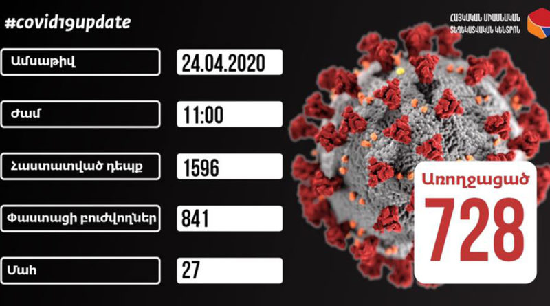 Հայաստանում ապրիլի 24-ի դրությամբ հաստատվել է կորոնավիրուսով վարակման 73 նոր դեպք։ Վարակվածների ընդհանուր թիվը հասել է 1596-ի: