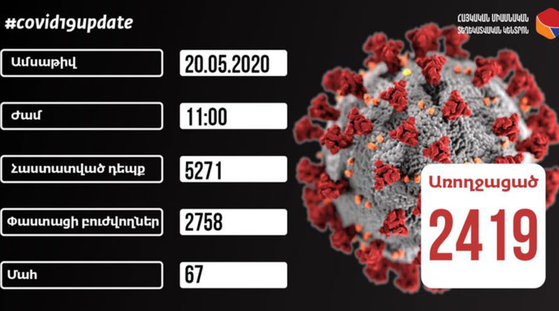 Մայիսի 20-ի, ժամը 11:00-ի դրությամբ հաստատվել է կորոնավիրուսային հիվանդության ընդհանուր 5271 դեպք, որոնցից 2419-ն` առողջացած, 67-ը` մահվան ելքով: Կորոնավիրուսային հիվանդությամբ այս պահին փաստացի բուժում է ստանում 2758 պացիենտ: ԱՆ մամուլի ծառայության տեղեկացմամբ, ընդհանուր առմամբ, կատարվել է 44071 թեստավորում: