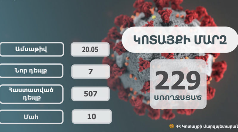 «Մայիսի 20-ի ժամը 11:00-ի դրությամբ Կոտայքի մարզում ունենք կորոնավիրուսային հիվանդության 507 հաստատված դեպքեր, որից առողջացել են 229 քաղաքացիներ, արձանագրված մահերի թիվը 10 է: