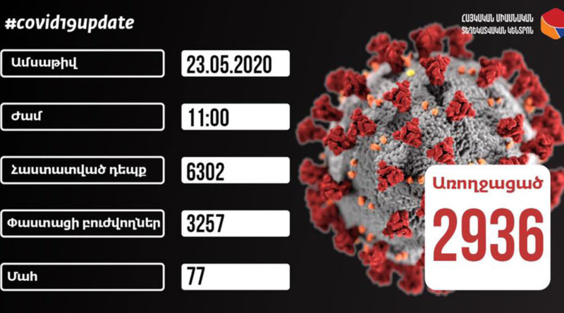 Հայաստանում մայիսի 23-ի դրությամբ հաստատվել է կորոնավիրուսով վարակման 374 նոր դեպք: Մահացել է ևս 3 քաղաքացի: Վարակվածների ընդհանուր թիվը 6302 է, մահացածների թիվը՝ 77: