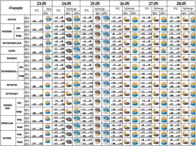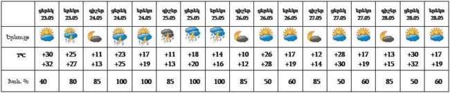 Երևան քաղաքում՝ մայիսի 23-ին քաղաքի առանձին հատվածներում սպասվում է կարճատև անձրև և ամպրոպ։ Մայիսի 24-25-ը սպասվում է անձրև և ամպրոպ։ Մայիսի 26-28-ը սպասվում է առանց տեղումների եղանակ: Ամպրոպների ժամանակ սպասվում է քամու ուժգնացում՝ 20-22 մ/վ։