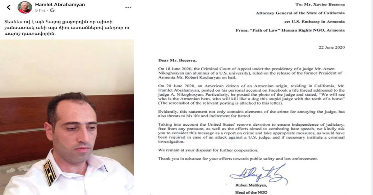 2020 թվականի հունիսի 20-ին Ամերիկայի Կալիֆորնիա նահանգում բնակվող հայազգի, ԱՄՆ քաղաքացի Համլետ Աբրահամյանն իր ֆեյսբուքյան էջում կատարել է կյանքի սպառնալիք հանդիսացող գրառում: Մասնավորապես, օգտատերը տեղադրել է դատավոր Նիկողոսյանի լուսանկարը և կատարել հետևյալ գրառումը․ «Տեսնես ով է այն հայոց քաջորդին որ պիտի շանսատակ անի այս ձիու ատամներով անդուր ու ապուշ դատավորին» (ֆեյսբուքյան գրառման արտատպումը կցված է սույն նամակին)։