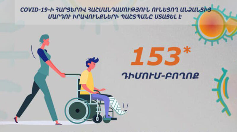 ՄԻՊ գրասենյակի տեղեկացմամբ, մարտի 16-ից հունիսի 24-ը նոր տեսակի կորոնավիրուսի (COVID-19) վարակի հետ կապված հարցերով հաշմանդամություն ունեցող անձանցից ստացվել է 153 դիմում-բողոք, որից Մարդու իրավունքների պաշտպանի աշխատակազմի 116 թեժի գծին ուղղված ահազանգերի թիվը կազմել է 74: