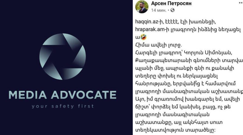 «Հրապարակ» օրաթերթի լրագրող Կորյուն Սիմոնյանը դիմել է «Մեդիա պաշտպան» նախաձեռնությանը` նշելով, որ Էջմիածնի փոխքաղաքապետ Արսեն Պետրոսյանը վիրավորական արտահայտություններ է թուլ տվել իր հասցեին։