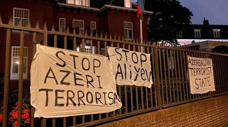 Անցած գիշեր Հաագայում (The Hague – Den Haag) Ադրբեջանի դեսպանատան դիմաց փակցվել էին հետևյալ կոչերը՝ «Ադրբեջանական ահաբեկչական պետություն», «Stop Ալիև» և «Դադարեցրեք ադրբեջանական ահաբեկչությունը»: