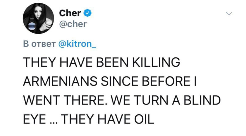«Նրանք հայերին սպանում էին նախքան իմ՝ այնտեղ այցը։ Մենք աչք ենք փակում այդ ամենի վրա։ Նրանք նավթ ունեն»,- գրել է երգչուհին։