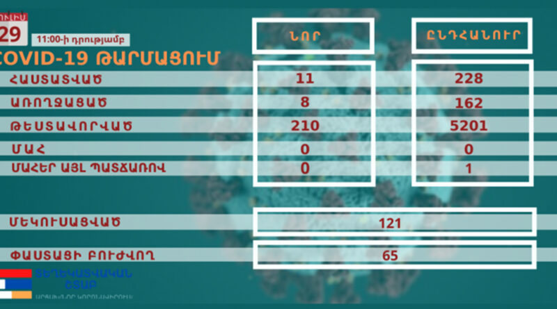 Առայսօր, COVID-19-ը ախտորոշվել է 228 մարդու մոտ, որից 162-ը հաղթահարել է հիվանդությունը: Փաստացի բուժում է ստանում 65, ընդհանուր մեկուսացված է 121 քաղաքացի: