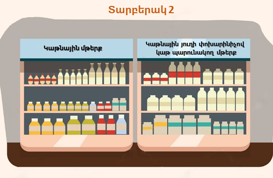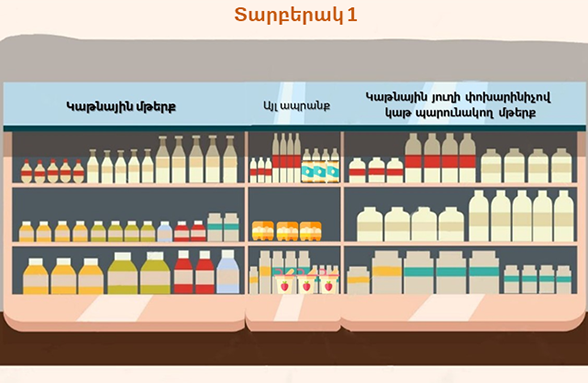 «Մենք ցանկանում ենք հորդորել Ձեզ՝ մինչև օրենքի կիրառումը համագործակցության սկզբունքով աշխատել և նախաձեռնել այդ փոփոխությունները, որպեսզի առևտրի կետերում կաթնային յուղի փոխարինիչով կաթ պարունակող մթերքները ցուցադրվեն կաթնային մթերքներից առանձին՝ տարբեր սպառողական դարակներում կամ սառնարաններում կամ այդպիսի հնարավորության բացակայության դեպքում՝ դարակի կամ սառնարանի միմյանցից առանձնացված հատվածներում՝ միաժամանակ հստակ, տեսանելի և ընթեռնելի նշելով ապրանքախմբերի անվանումները»,-նշել է ՏՄՊՊՀ ներկայացուցիչը՝ հավելելով, որ հանձնաժողովի աշխատակիցները պատրաստակամ են այցելել և տեղոււմ մասնագիտական խորհրդատվություն տրամադրել, ինչպես նաև օժանդակել հանրայնացնելու իրականացված փոփոխությունները: