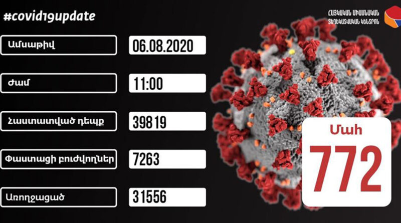 Հայաստանում օգոստոսի 6-ի դրությամբ հաստատվել է կորոնավիրուսով վարակման 233 նոր դեպք, վարակվածների ընդհանուր թիվը հասել է 39819-ի: