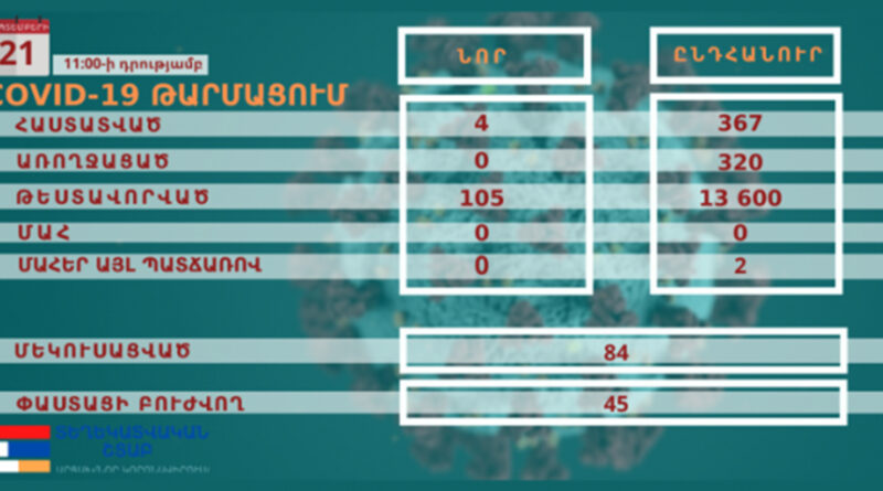 Առայսօր, COVID-19-ը ախտորոշվել է 367 մարդու մոտ, որից 320-ը հաղթահարել է հիվանդությունը: Փաստացի բուժում է ստանում 45, ընդհանուր մեկուսացված է 84 քաղաքացի: