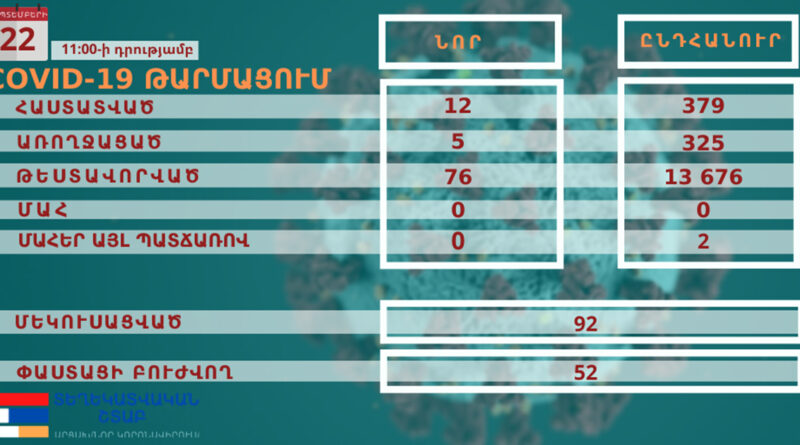 Արցախում կորոնավիրուսով վարակման 12 նոր դեպք է գրանցվել, փաստոցի բուժվում է 52 քաղաքացի