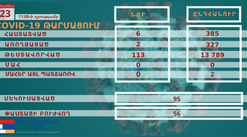 Առայսօր, COVID-19-ը ախտորոշվել է 385 մարդու մոտ, որից 327-ը հաղթահարել է հիվանդությունը: Փաստացի բուժում է ստանում 56, ընդհանուր մեկուսացված է 95 քաղաքացի: