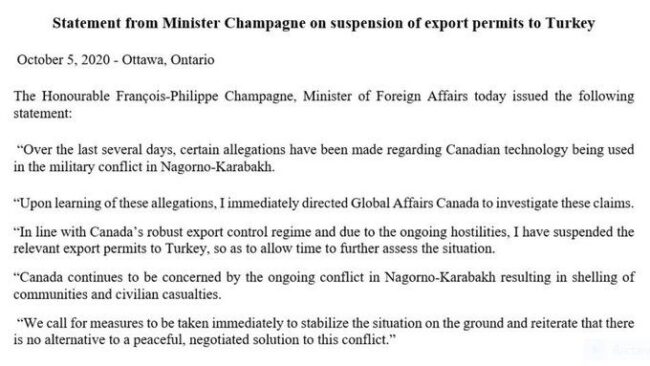 «Վերջին օրերին պնդումներ են հնչում, թե կանադական տեխնոլոգիաներ են օգտագործվում Լեռնային Ղարաբաղի զինված հակամարտությունում։ Այդ մեղադրանքներից ելնելով՝ ես հանձնարարել եմ Global Affairs Canada-ին անհապաղ հետաքննություն սկսել այդ պնդումների կապակցությամբ։ Կանադայի արտահանման խիստ ռեժիմի և ընթացիկ հետաքննությանը համապատասխան՝ ես կասեցրել եմ համապատասխան արտահանումները»,- գրել էր արտգործնախարարը։