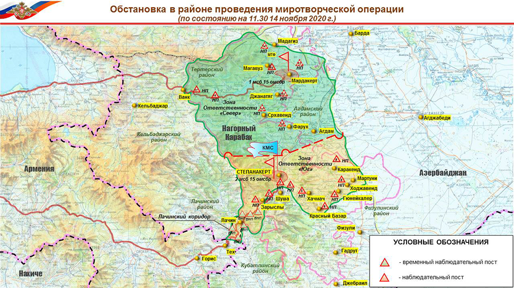 Ռուսաստանի Դաշնության պաշտպանության նախարարությունը ինֆոգրաֆիկայի (տեղապատկերում) տեսքով ներկայացրել է նոյեմբերի 14-ի դրությամբ Լեռնային Ղարաբաղում ռուսական խաղաղապահների դիտակետերի տեղակայման մասին տվյալները: ՌԴ ՊՆ հաղորդագրության մեջ նշվում է, որ նոյեմբերի 14-ին խաղաղապահ առաքելություն իրականացնելու նպատակով շփման գծի երկայնքով տեղակայվել է 12 դիտորդական կետ: