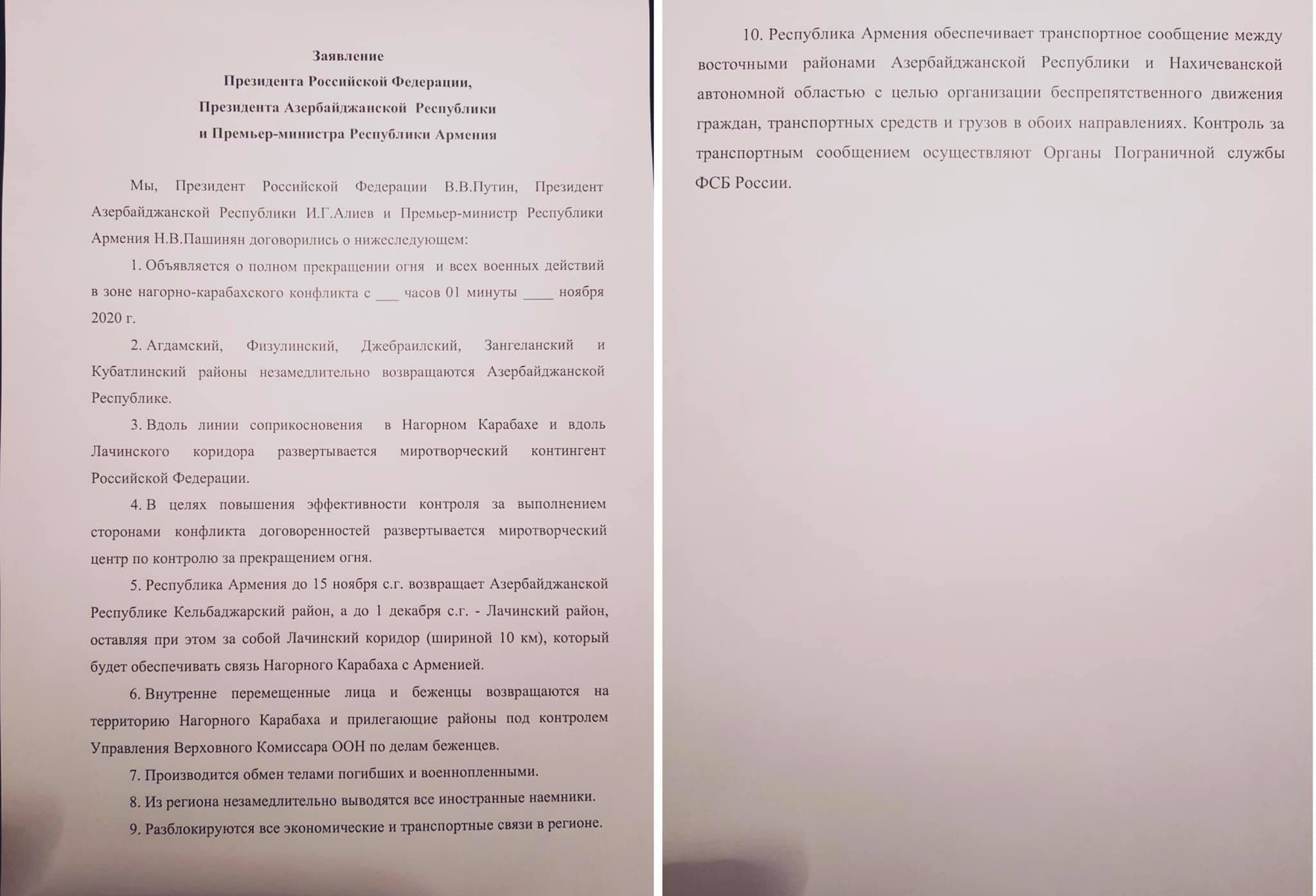 -Չկա ձևակերպում այն մասին, որ երկուստեք զորքերը մնալու են այնտեղ,  ուր հասել են, ինչը դիվանագիտական լեզվով նշանակում է, որ հայկական տիրույթում մնալու էր ամբողջ նախկին ԼՂԻՄ տարածքը։  Խաղաղապահ զորքերը տեղակայլվելու էին նախկին ԼՂԻՄ սահմանին։