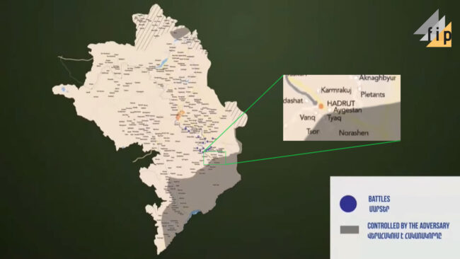Պատերազմի ավարտից առաջ ռազմական գործողությունները պատկերող քարտեզ վերջին անգամ ներկայացվեց Արծրուն Հովհաննիսյանի նոյեմբերի 3-ի ճեպազրույցի ժամանակ։ Այդ օրը ներկայացված քարտեզում ևս Հադրութ քաղաքը նշված չէր ադրբեջանական վերահսկողության ներքո։