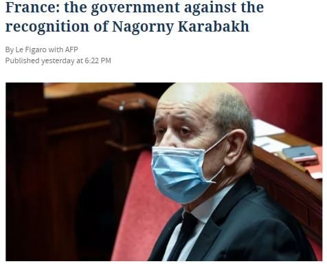 Le Figaro-ն գրում է, որ Ֆրանսիայի ԱԳ նախարար Ժան-Իվ Լե Դրիանը դեմ է Լեռնային Ղարաբաղի ճանաչման մասին նախաձեռնությունը։ «Անգամ մեր հայ բարեկամները մեզ չեն դիմել այդ խնդրանքով։ Նման որոշումը կնշանակեր Ֆրանսիայի բացառումը ԵԱՀԿ Մինսկի խմբի համանախագահների կազմից, որտեղ միավորված են Փարիզը, Մոսկվան և Վաշինգտոնը, և որը ղարաբաղյան հակամարտության կարգավորման եղանակներ է փնտրում: Դա մեզ համար կնշանակեր հրաժարում միջնորդի դերից»,- նշել է ֆրանսիացի նախարարը։