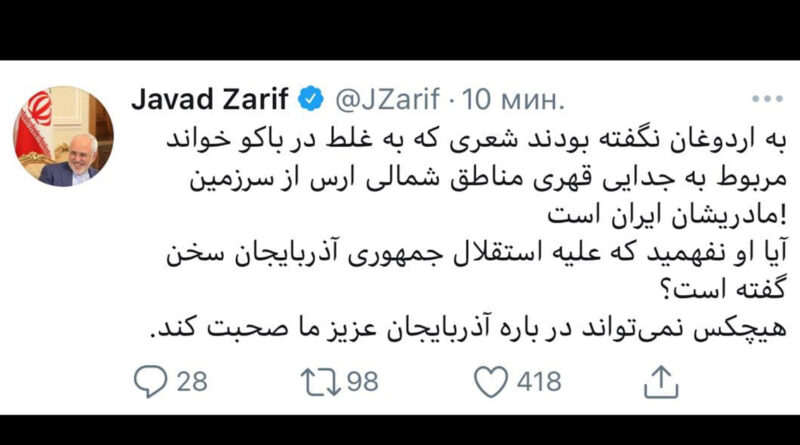 Իրանի ԱԳ նախարար Մոհամադ Ջավադ Զարիֆը արձագանքել է Բաքվում երեկ կայացած շքերթի ժամանակ Թուրքիայի նախագահ Ռեջեփ Թայիփ Էրդողանի ելույթին․