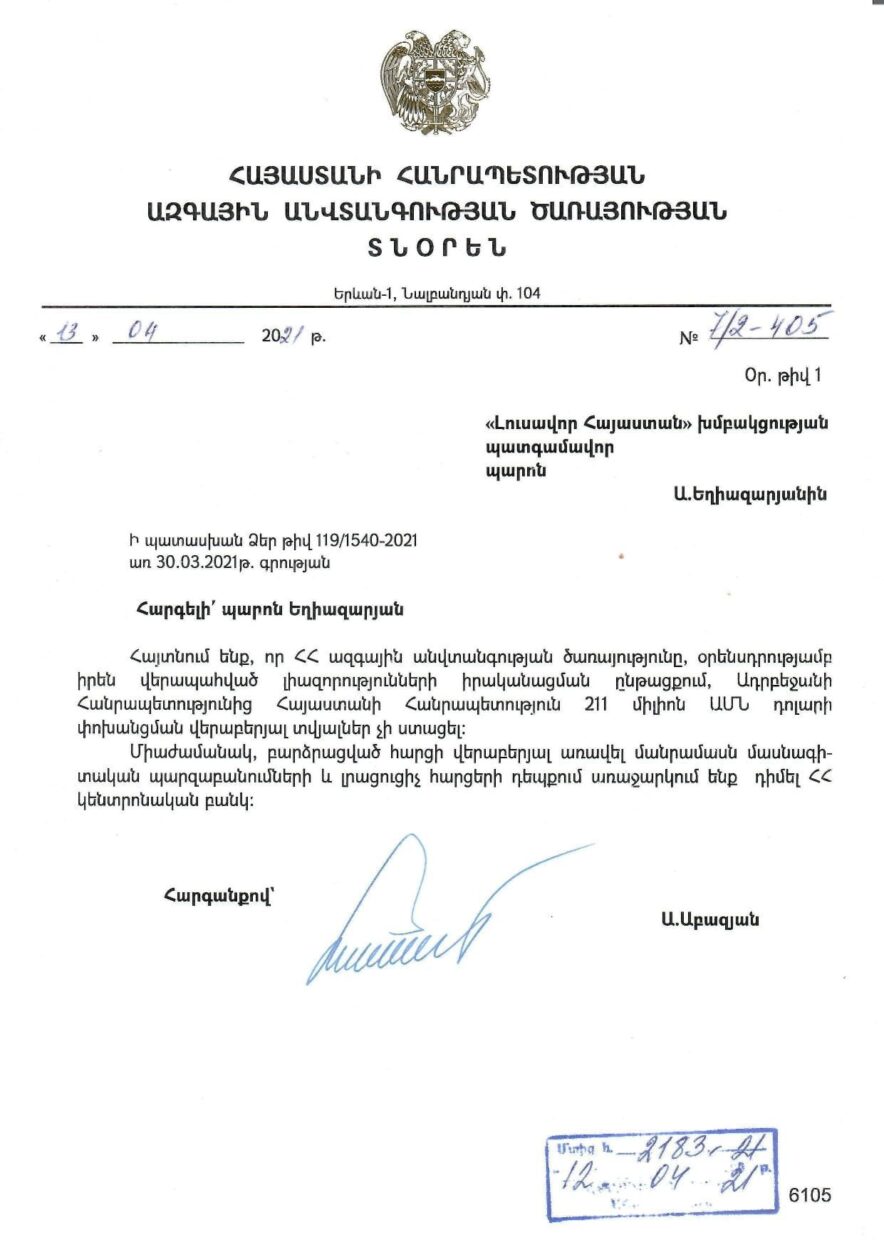 ԱԱԾ-ից հայտնել են, որ իրենք անելիք չունեն Ադրբեջանից Հայաստան 211 միլիոն դոլար փոխանցելու հարցը պարզելու գործում