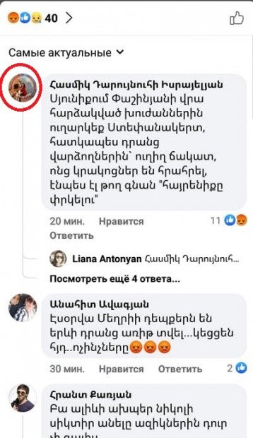 Հասմիկ Իսրայելյան անունով օգտատերերից մեկն օրինակ Փաշինյանի այցի դեմ բողոքի ակցիա իրականացնող սյունեցիների հասցեին մեկնաբանել է. «Սյունիքում Փաշինյանի վրա հարձակված խուժաններին ուղարկեք Ստեփանակերտ, հատկապես դրանց վարձողներին՝ ուղիղ ճակատ, ոնց կրակոցներ են հրահրել, էնպես էլ թող գնան «հայրենիքը» փրկելու»։ Մեկ այլ գրառման մեջ այս օգտատերը սյունեցիներին անվանել է «սրիկաներ»։