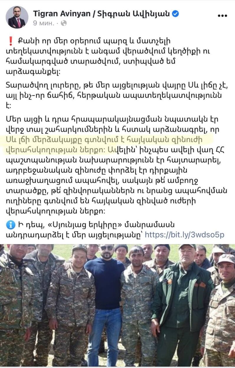 Հիշեցնենք, որ ավելի վաղ Ավինյանը հայտնել էր, որ գտնվում է Սև լճի տարածքում, իսկ Սյունիքի մարզպետն էլ Հ1-ով հայտարարել է, թե Սև լիճն է գտնվում մեր վերահսկողության տակ։