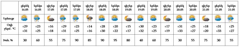 Հայաստանի տարածքում մայիսի17-ի ցերեկը, 18-ին շրջանների զգալի մասում, 21-ին կեսօրից հետո առանձին շրջաններում սպասվում է կարճատև անձրև և ամպրոպ: Առանձին հատվածներում հնարավոր է կարկուտ։ Մայիսի 19-20-ն սպասվում է առանց տեղումների եղանակ: