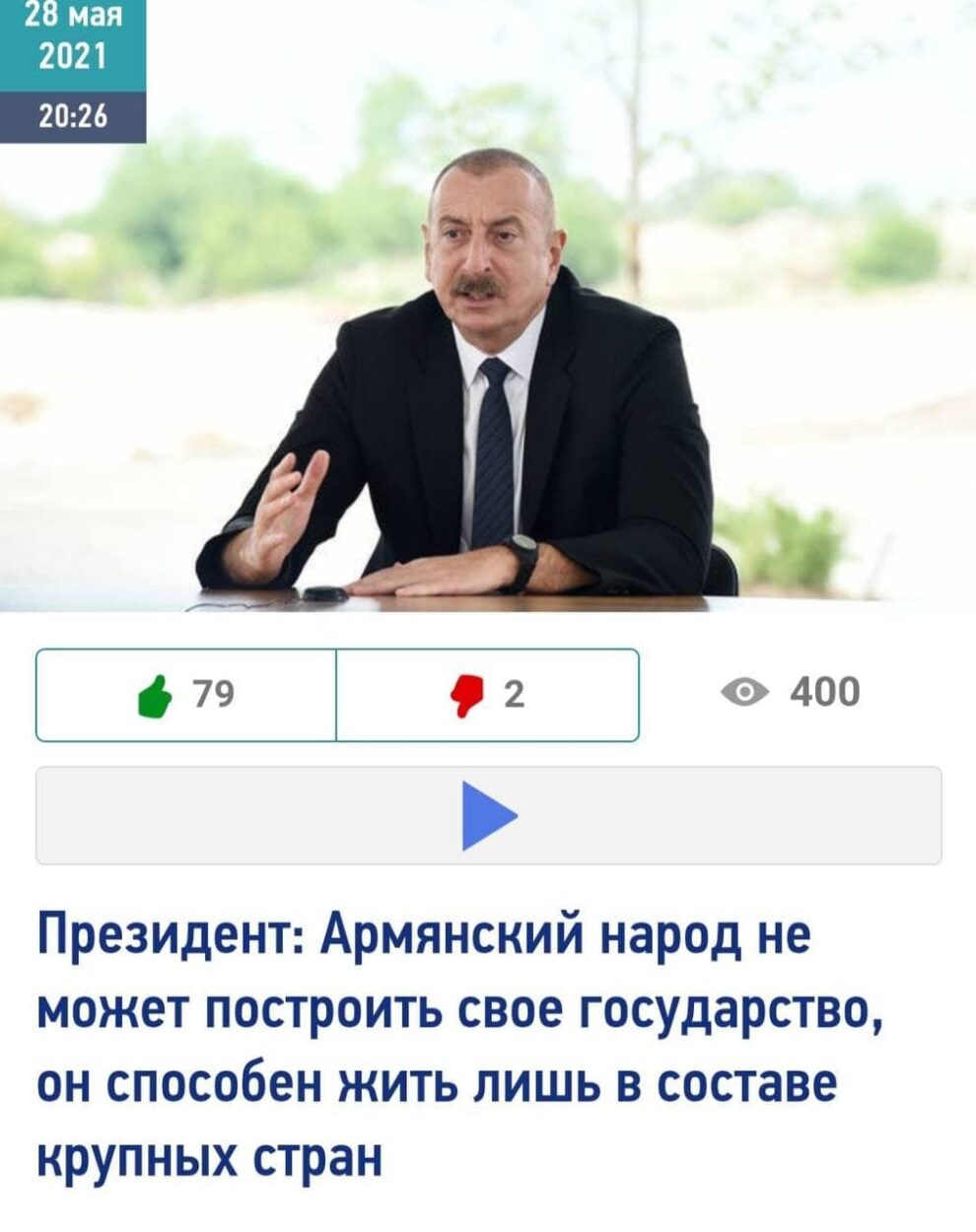 «Նայեք նրանց հիմա, որքան խղճուկ են, ամբողջ աշխարհը ծիծաղում է նրանց վրա. Վարչապետը հայտարարում է մի բան, Գլխավոր շտաբի պետի տեղակալը՝ մեկ այլ բան։ Եվ երկու տարբերակներն էլ սուտ են։ Եվ սա նույն օրվա ընթացքում։ Այլ խոսքերով՝ հայերը չկարողացան պետություն կառուցել 30 տարվա ընթացքում։ Այդ ժողովուրդն ընդունակ չէ դրան։ Նրանք կարող են գոյատևել միայն ավելի խոշոր երկրների կազմում,-ասել է Իլհամ Ալիևը՝ Աղդամում (Ակնա) հասարակության հետ հանդիպման ժամանակ: