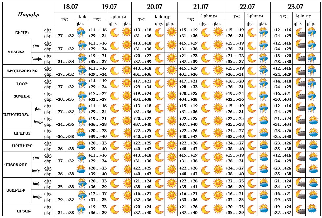 Սահարա անապատից արևադարձային տաք օդային հոսանքների ներթափանցմամբ պայմանավորված` հուլիսի 18-20-ը Հայաստանի ողջ տարածքում օդի ջերմաստիճանն աստիճանաբար կբարձրանա 8-10 աստիճանով՝ հուլիսի 19-21-ն Արարատյան դաշտում և նրա նախալեռներում, Վայոց Ձորի նախալեռներում, Սյունիքի հովտային շրջաններում և Երևանում ցերեկային ժամերին հասնելով +40․․․+42 աստիճանի։ Նշված գոտիներում սպասվում է նաև բարձր կարգի հրդեհավտանգ իրավիճակ: