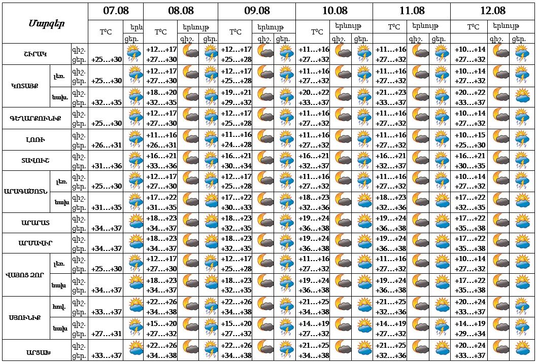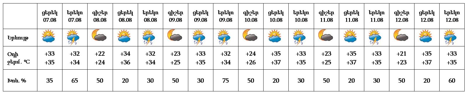 Օգոստոսի 7-12-ը՝ երեկոյան ժամերին, առանձին հատվածներում սպասվում է կարճատև անձրև և ամպրոպ, ամպրոպի ժամանակ հնարավոր է քամու ուժգնացում՝ 18-20 մ/վ արագությամբ: