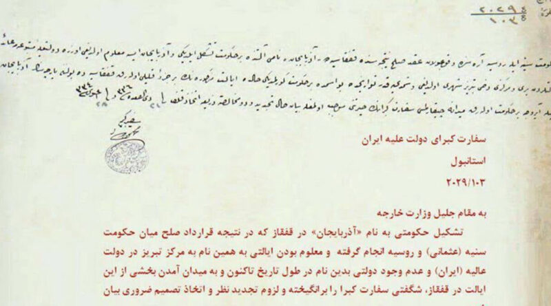 Կովկասում ռուս-օսմանական հաշտության պայմանագրի հետևանքով «Ադրբեջան» անունով պետություն է կյանքի կոչվում, հաշվի առնելով, որ Իրանի պետության սահմաններում Թավրիզի գլխավորությամբ այդ անունով նահանգ գոյություն ունի և այն, որ պատմության մեջ երբեք այդ անունով պետություն գոյություն չի ունեցել, հետևաբար Իրանի պետությունը ապշած է և վերանայելու անհրաժեշտություն է զգում այս խնդրում: