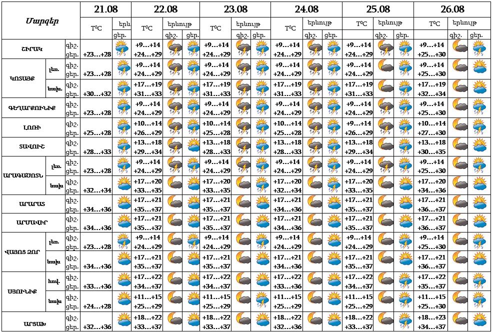 Օգոստոսի 21-ի ցերեկը, 22-26-ին` գիշերը և կեսօրից հետո առանձին շրջաններում սպասվում է կարճատև անձրև և ամպրոպ, առանձին հատվածներում հնարավոր է նաև կարկուտ։