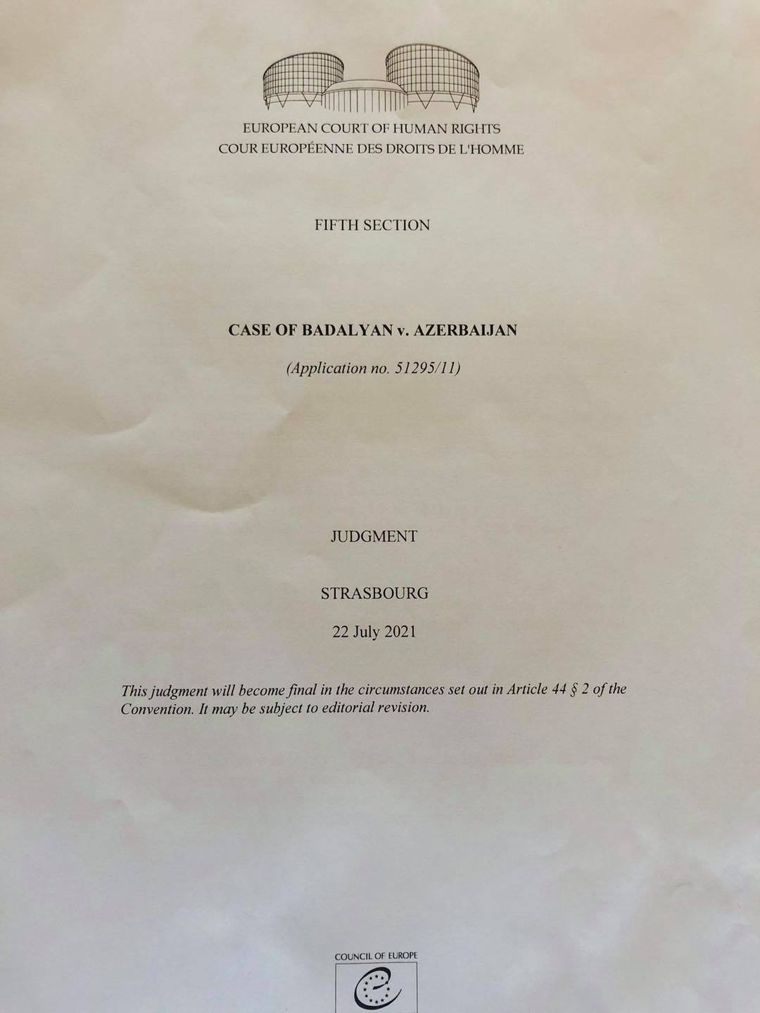 Հիշեցնենք, որ ՄԻԵԴ վճռով արձանագրվել էր, որ 2009-2011 թթ. Ադրբեջանը խոշտանգել և ապօրինի ազատությունից զրկել է Արթուր Բադալյանին, որը մոլորվել էր և հայտնվել Ադրբեջանի տարածքում: