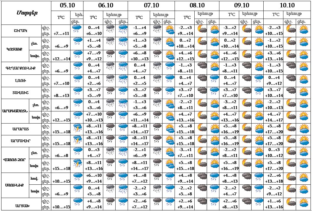 Հոկտեմբերի 5-ի ցերեկը, 6-ին, 7-ի գիշերը շրջանների զգալի մասում, 7-ի ցերեկը, 8-9-ը Լոռիում, Տավուշում, Սյունիքում և Արցախում սպասվում են տեղումներ: Հոկտեմբերի 10-ին սպասվում է առանց տեղումների եղանակ։