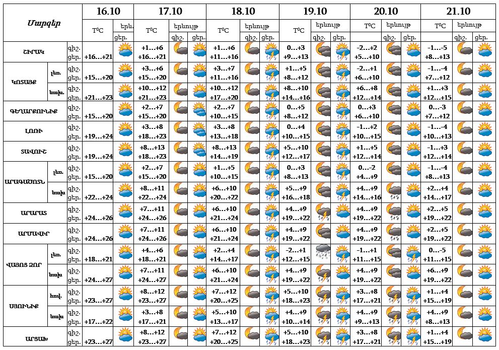 Հոկտեմբերի 16-ի ցերեկը, 17-ին, 18-ի գիշերը և 21-ին սպասվում է առանց տեղումների եղանակ։ Հոկտեմբերի 18-ի ցերեկը, 19-ին շրջանների զգալի մասում, 20-ին առանձին շրջաններում սպասվում է անձրև և ամպրոպ: