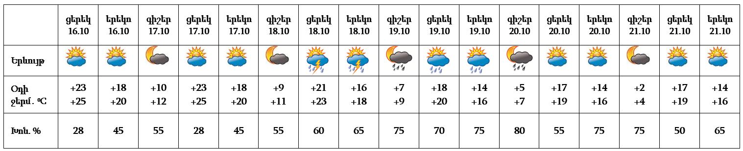 Հոկտեմբերի 16-ի ցերեկը, 17-ին, 18-ի գիշերը և 20-21-ի ցերեկը սպասվում է առանց տեղումների եղանակ։ Հոկտեմբերի 18-ի ցերեկը, 19-ին և 20-ի գիշերը սպասվում է անձրև և ամպրոպ:
