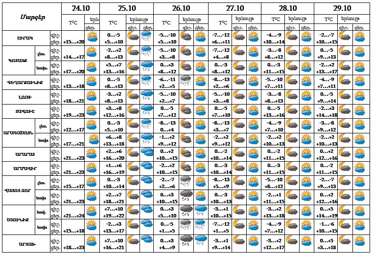 Հայաստանի տարածքում հոկտեմբերի 24-ի ցերեկը, 25-ի գիշերը, 27-29-ն սպասվում է առանց տեղումների եղանակ: Հոկտեմբերի 25-ի կեսօրից հետո, 26-ին՝ առանձին շրջաններում սպասվում են տեղումներ: