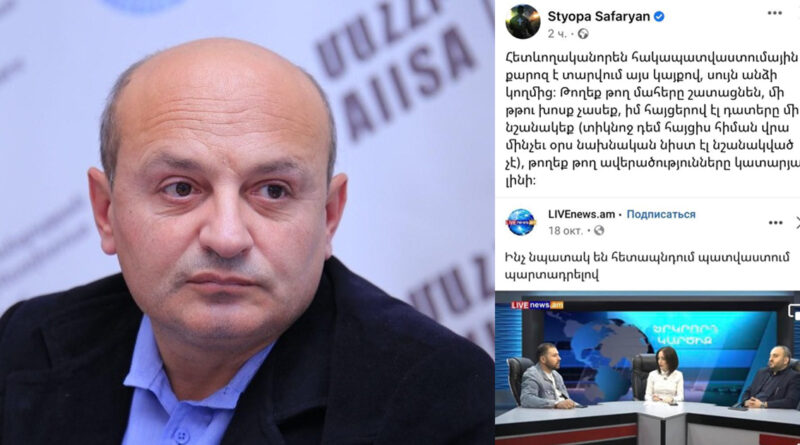 Ոմն Ստյոպա Սաֆարյան, որը ներկայանում է իբրև Հայաստանում ժողովրդավարության սերմանման ու տարածման ջատագով ու մարդու իրավունքների պաշտպան, բայց էքստազի հասնող հաճույք է ստանում հատկապես հայ կանանց վիրավորելով ու զրպարտանքի միջոցով վարկաբեկելով, որը մինչև այս տարվա խորհրդարանական ընտրությունները Հանրային խորհրդի անհաջող նախագահ էր, չի պատկերացնում իր կյանքը առանց LIVEnews.am կայքի մասին վարկաբեկիչ հայտարարություններ անելու՝ անձնական ոխերիմ թշնամանք ունենալով կայքի աշխատողների նկատմամբ։ Դրա մասին են փաստում կայքի լրագրողների հասցեին նրա վարկաբեկիչ, վիրավորական ֆեյսբուքյան գրառումները (նկատենք՝ նորից կանայք են։ Այդ մարդու ուժը միայն կանանց է պատում կամ գուցե կանանց հետ անձնական հաշվեհարդարի խնդի՞ր ունի)։ Իսկ երկու տարի առաջ էլ սույն անձը վիրավորել էր կայքի լրագրող Թագուհի Ասլանյանին, երբ նա իր մասնագիտական պարտականություններն էր իրացնում մեծարգո պարոնի ղեկավարած կառույցի տարածքում, որից հետո էլ սեփական ֆեյսբուքյան տիրույթում լկտի, սանձարձակ վիրավորական արտահայտություններ էր գրել լրագրողի մասին՝ մտածելով, թե ինչպես միշտ, այս անգամ էլ նրա վարքագիծը կհանդուրժեն՝ որպես անմեղսունակի։ Սակայն Թագուհի Ասլանյանը դիմեց դատարան՝ արժանապատվությունը վիրավորելու մասին հայցով և երեք ատյաններում էլ դատարանը դատապարտեց Սաֆարյանին՝ հօգուտ հայցվորի որոշում կայացնելով ու Սաֆարյանին 600 հազար դրամի տուգանքի դատապարտելով։ Փոխհատուցումից բացի՝ դատարանի որոշմամբ, ժողովրդավարության սույն մոլեռանդ պաշտպանը պետք է նաև ներողություն խնդրի տիկնոջից անհարկի վիրավորանքների համար։ Եվ ահա դատարանի որոշումները իսկական մղձավանջ են դարձել Սաֆարյանի համար, քանի որ նա խոշորացույցի տակ պահելով Թագուհի Ասլանյանի ֆեյսբուքյան էջը, ինչպես նաև LIVEnews.am կայքի հրապարակումները՝ ջանք ու եռանդ չի խնայում դատարան հայց ներկայացնելու համար պատրվակներ գտնելու։ Հետն էլ աղաղակում է (բնականաբար նորից իր ֆեյսբուքյան էջում՝ երկրպագուների շրջանում, քանի որ այլ տեղ նրան պարզապես ուշադրություն դարձնող չկա), թե դատարանները վաճառված են, կաշառված, և իր դեմ երեք ատյանների մակարդակով անարդարացի, կողմնակալ որոշում է կայացվել։ Վառ երևակայության տեր այս անձը այնքան է մոլորվել իր վերլուծություններում, որ պնդումներ է անում, թե իբրև դատական հայցի վերաբերյալ որոշումները երեք ատյանների դատարաններում անձամբ ՀՀ երկրորդ նախագահ Ռոբերտ Քոչարյանն է ուղղորդել։ Նման հանճարեղ հետևության է եկել նա այն բանից, որ Թագուհի Ասլանյանի հայցն առաջին ատյանի դատարանում քննում էր դատավոր Զարուհի Նախշքարյանը, որը Ռոբերտ Քոչարյանի դատապաշտպան, արդեն լուսահոգի Ռուբեն Սահակյանի հոգեզավակն է։ Իսկ թե Թագուհի Ասլանյանն ի՞նչ կապ ունի երկրորդ նախագահի հետ, Երբեմնի ՀԽ նախագահը դեռ այդ կապը չի գտել, բայց դա իրեն չի անհանգստացնում։ Ճիշտ նույն տրամաբանությամբ նա մեղադրում էր ՀԽ նախկին անդամ Լարիսա Ալավերդյանին՝ Թագուհի Ասլանյանի հետ կոռուպցիոն գործարքի մեջ մտնելու և ՀԽ-ում Սաֆարյանի դեմ քննադատող որոշում կայացնելու համար։