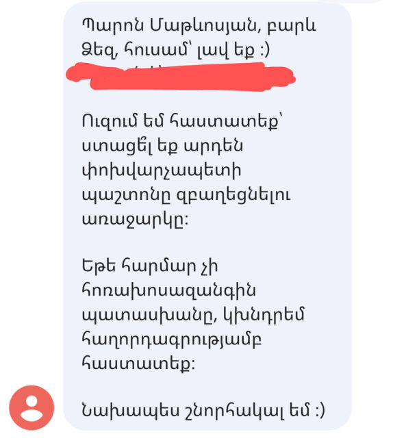 Իսկ նախօրեին զավեշտալի դեպք էր տեղի ունեցել։ Մեդիափորձագետ Սամվել Մարտիրոսյանը լրագրողից նամակ էր ստացել՝ հետևյալ բովանդակությամբ․ «Ուզում եմ հաստատեք՝ ստացե՞լ եք արդեն փոխվարչապետի պաշտոնն զբաղեցնելու առաջարկը։ Եթե հարմար չի հեռախոսազանգին պատասխանելը, խնդրեմ՝ հաղորդագրությամբ հաստատեք»։ «Շաքարս, ճնշումս ու վերջին մազերս սարսափից վեր թռան։ Մինչև հասկացա, որ լրագրողը համարով սխալվել ա»,- գրել էր Մարտիրոսյանը։