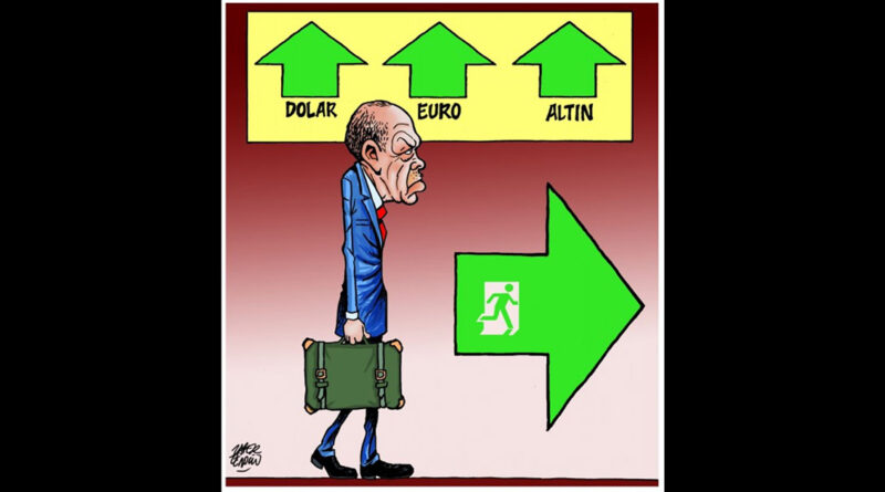 Ծաղրանկարում սլաքներով ցույց է տրվում, որ թուրքական լիրայի նկատմամբ դոլարի, եվրոյի փոխարժեքը, ինչպես նաև ոսկու գինը շարունակում է բարձրանալ, ինչի պատճառով էլ Թուրքիայի նախագահ Ռեջեփ Թայիփ Էրդողանը հավաքել է ճամպրուկը և հեռանում է իշխանությունից։