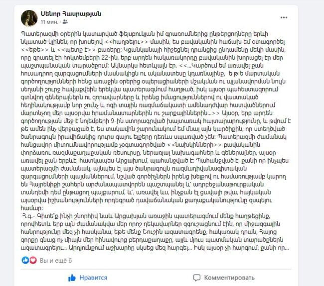 Արցախի ՊԲ նախկին խոսնակ Սենոր Հասրաթյանի ֆեյսբուքյան էջից։