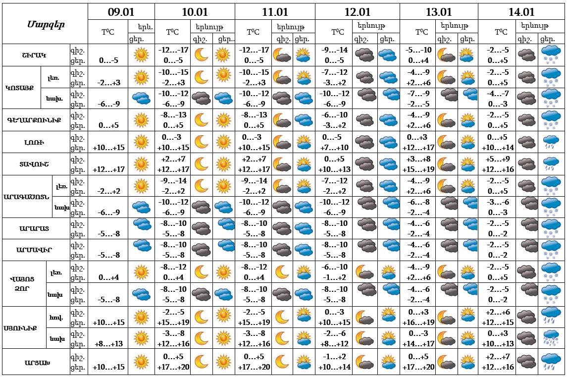 Հանրապետության տարածքում՝ հունվարի 9-ի ցերեկը, 10-13-ը սպասվում է առանց տեղումների եղանակ։ Հունվարի 14-ի ցերեկը շրջանների զգալի մասում սպասվում են տեղումներ։ Արարատյան դաշտում, Արագածոտնի, Կոտայքի և Վայոց Ձորի մարզերի նախալեռներում սպասվում է ամպամածություն և մառախուղ։ Այս մասին հայտնում են ԱԻՆ-ից։