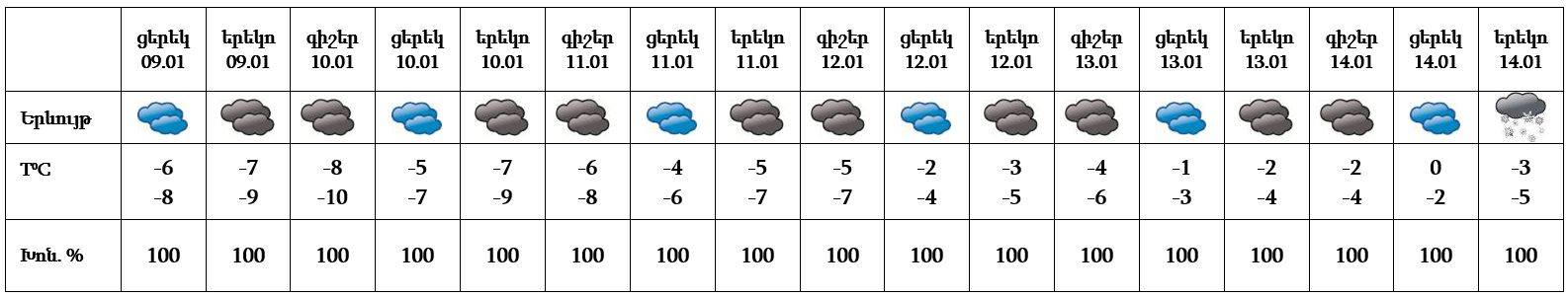 Երևան քաղաքում՝ հունվարի 9-ի ցերեկը, 10-13-ը սպասվում է ամպամածություն և մառախուղ։ Հունվարի 14-ի երեկոյան ժամերին սպասվում է ձյուն: